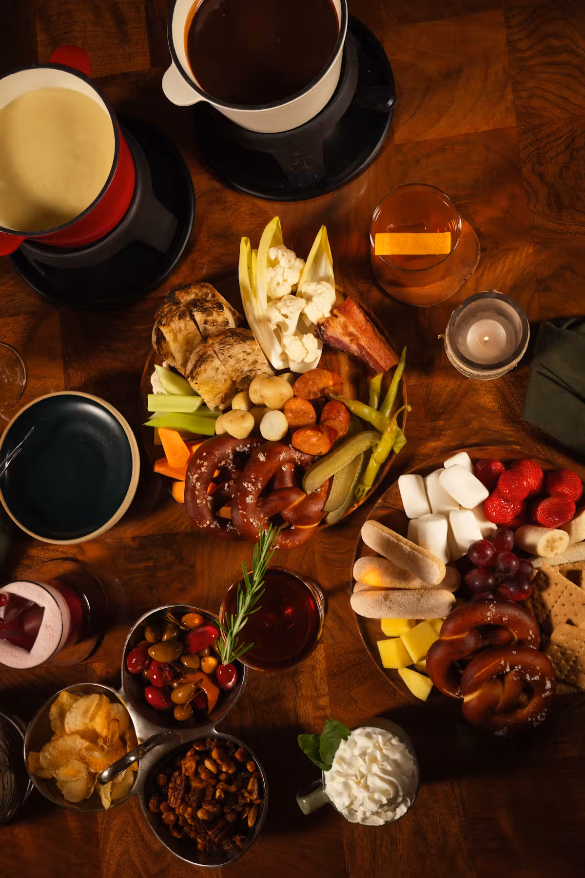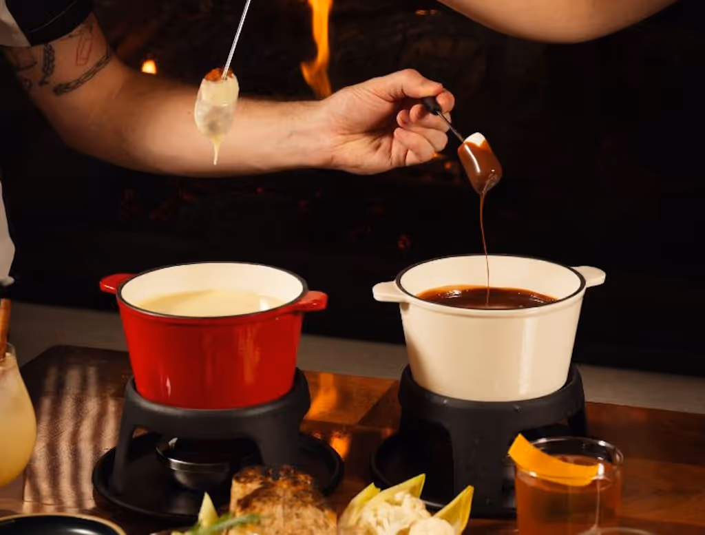 De domingo a quinta-feira, os visitantes podem escolher entre o fondue de queijo, servido com pães assados, picles, vegetais da estação e carnes curadas, ou a versão doce, com fondue de chocolate acompanhado de frutas frescas, marshmallows e nozes tostadas.