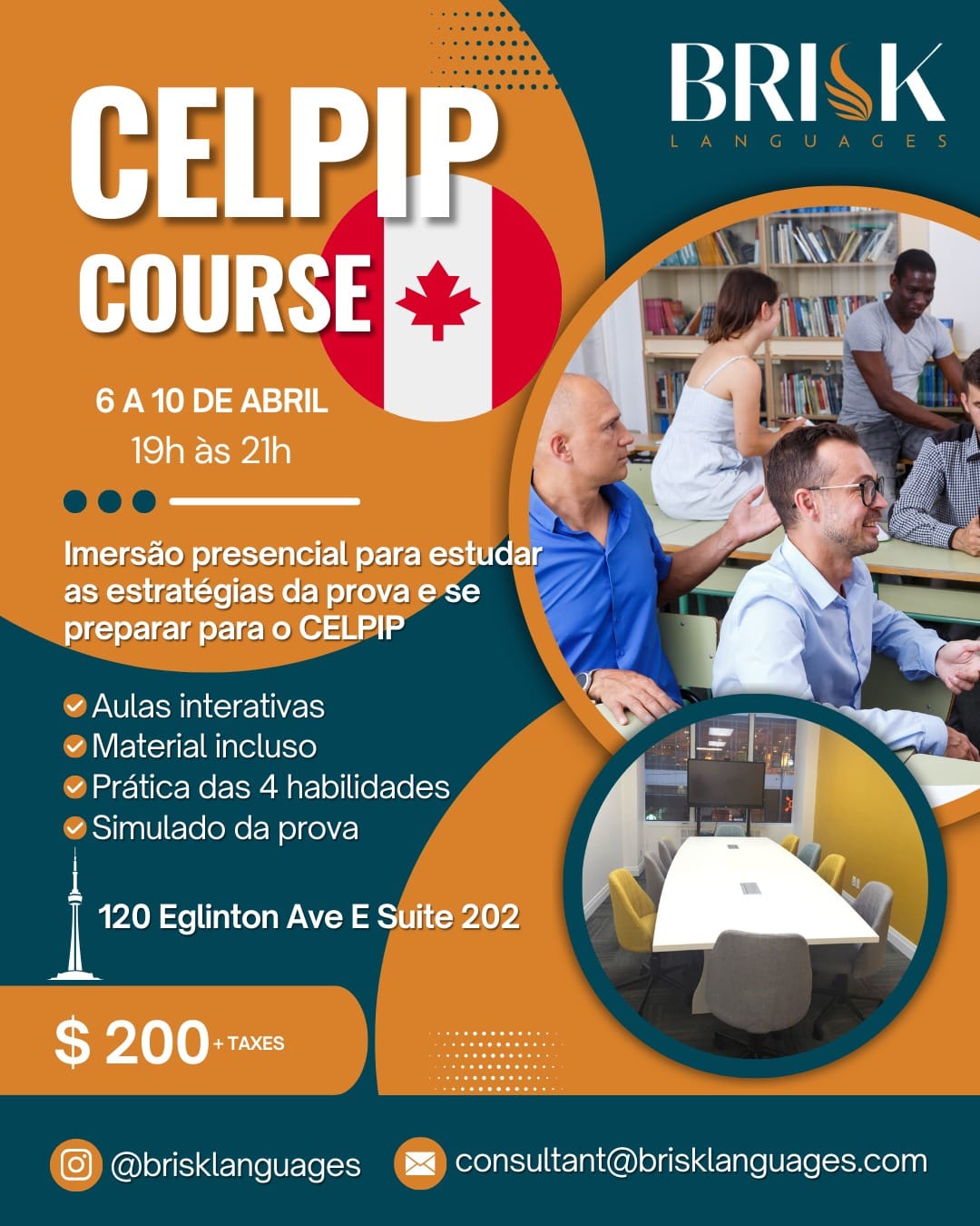 Na primeira semana de abril, a Brisk Languages realizará sua primeira Imersão Estratégica para o CELPIP, presencialmente em Toronto (Eglinton & Yonge), das 19h às 21h, de segunda a sexta-feira. O curso oferece preparação intensiva com foco nas 4 habilidades avaliadas (Listening, Reading, Writing e Speaking), incluindo estratégias práticas, correções direcionadas e um simulado completo ao final. Somos uma escola feita por professores, com 10 anos de experiência e alunos brasileiros em 4 continentes — agora também presencialmente no Canadá. São apenas 10 vagas. Garanta a sua agora mesmo!