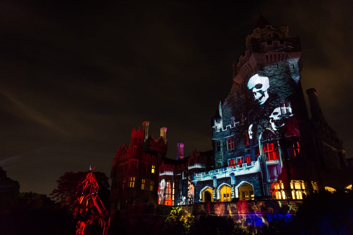Em outubro, a Casa Loma volta a ser palco de uma das experiências mais esperadas do outono em Toronto. O evento Legends of Horror transforma os jardins e túneis do castelo em um percurso imersivo de 2 km, onde o público caminha por cenários assustadores.
