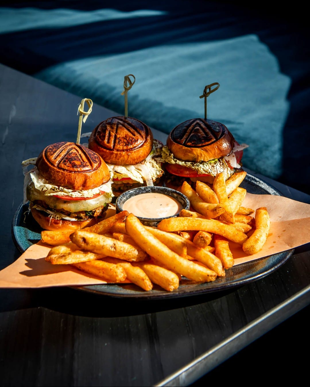 No Aera, o cardápio inclui duas opções irresistíveis: o Dry Aged Beef Burger ($34), com cheddar envelhecido, tomate, picles e cebola caramelizada, servido com batatas fritas, e os Ontario Lamb Sliders ($34), três mini sanduíches com molho toum verde, repolho e cebolas ao sumac, servidos com batatas fritas ou salada.