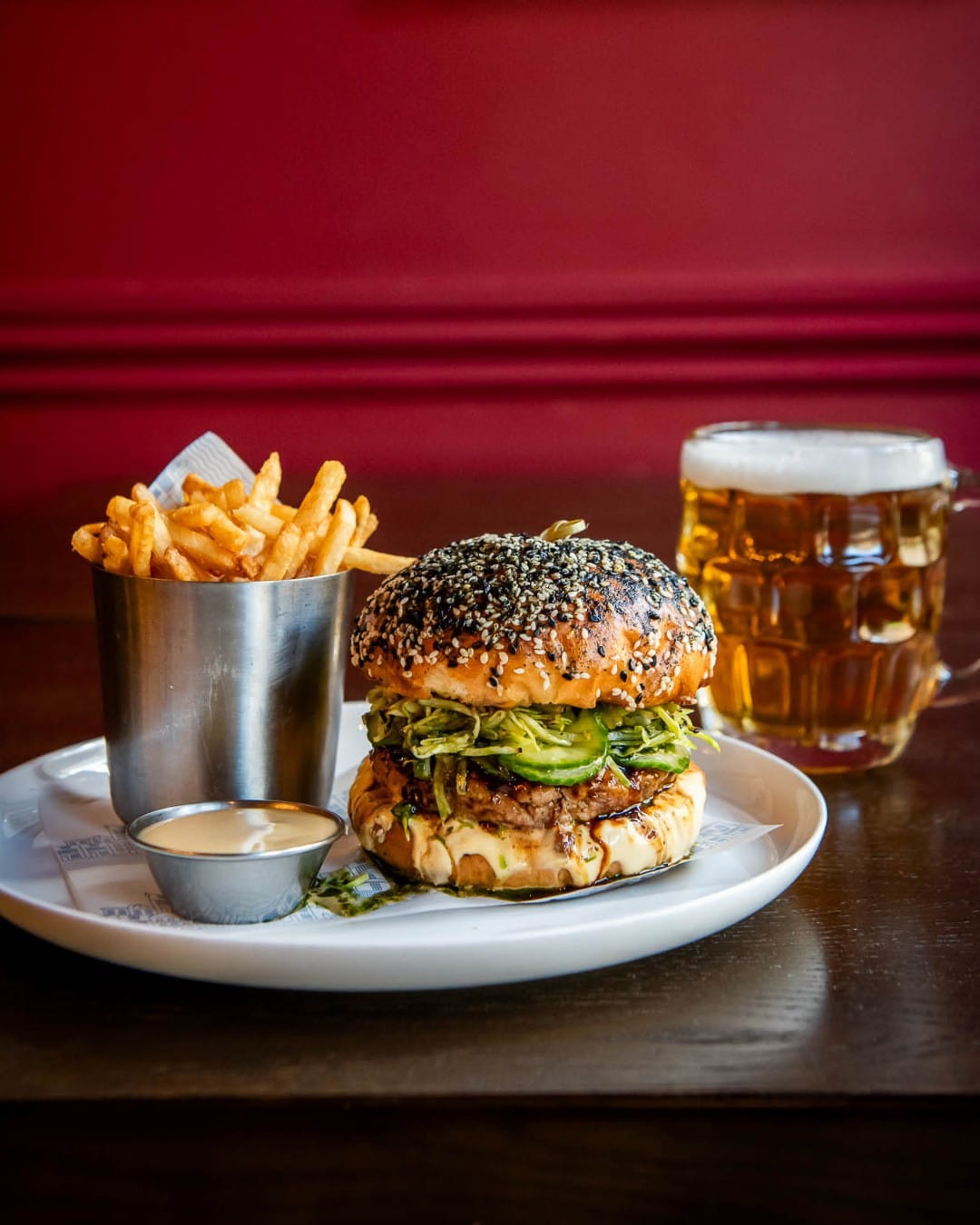 Já o National aposta no clássico NTNL Burger ($21), com dois hambúrgueres de carne, queijo americano, molho Clive, alface, tomate e picles, servido com batata shoestring ou salada Caesar.