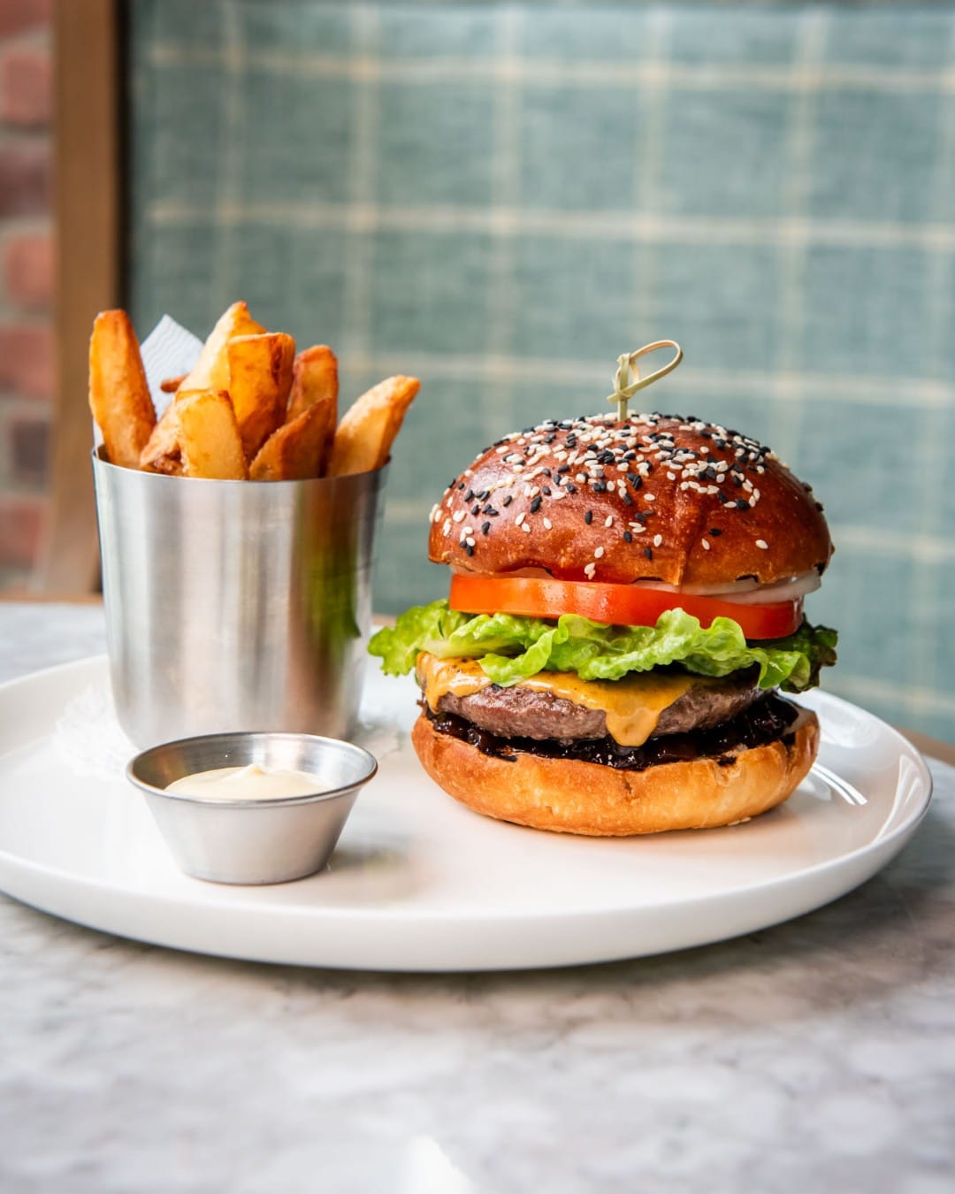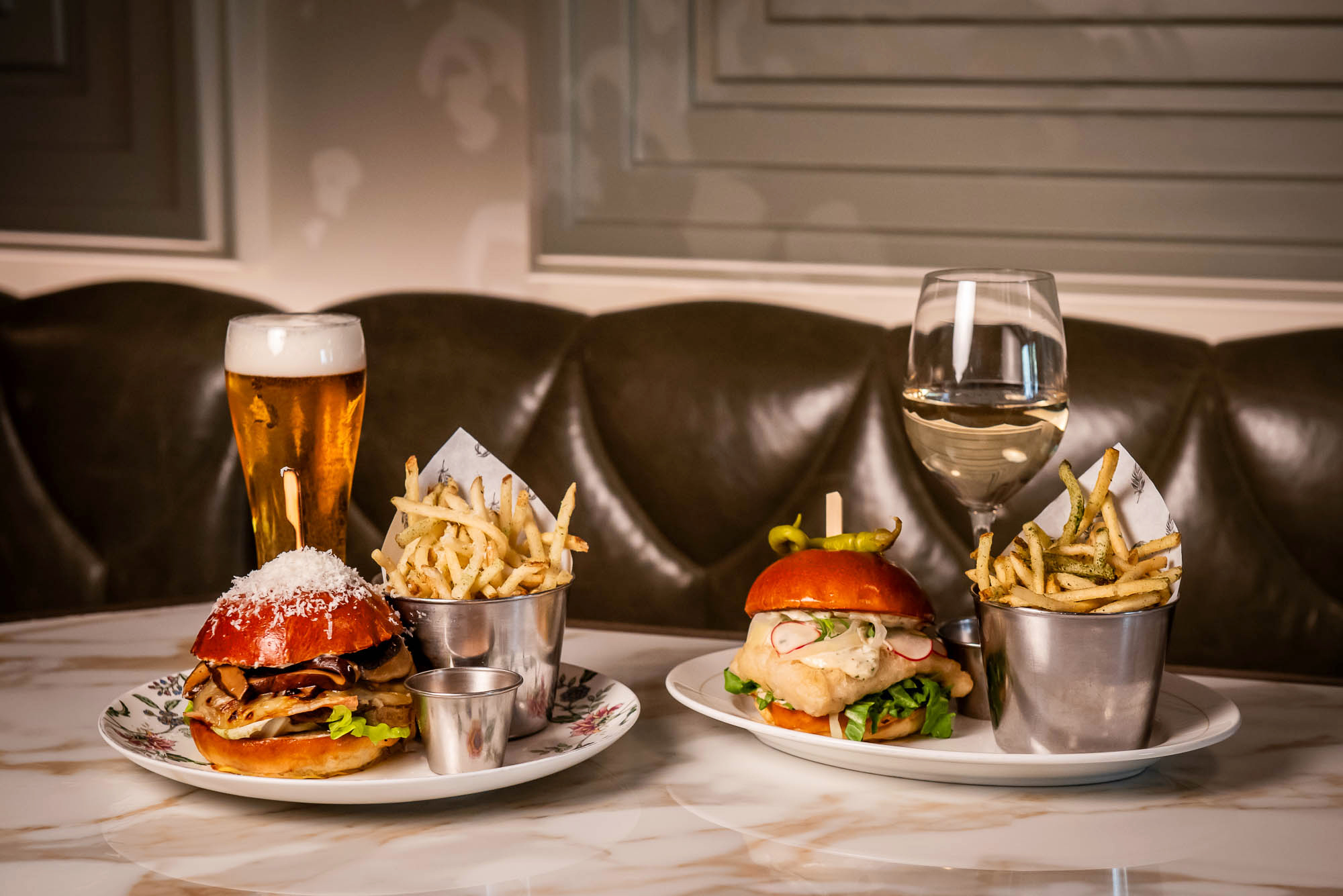 A brasserie La Plume apresenta três criações sofisticadas: o Umami Burger, com carne bovina moída na hora, cogumelos portobello marinados e queijo raclette; o French Onion Burger, com cebola caramelizada, queijo comté e maionese de alecrim e dijon; e o Nova Scotian Cod Burger, com bacalhau empanado, molho tártaro e pimentas guindilla.