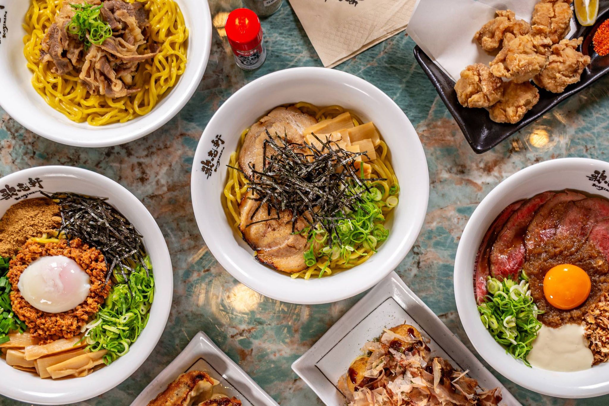 Quem preferir pode trocar a gema por ovo cozido ao molho de soja (ajitama) ou ovo pochê. Há também opções vegetarianas e acompanhamentos como karaage, takoyaki e gyoza.