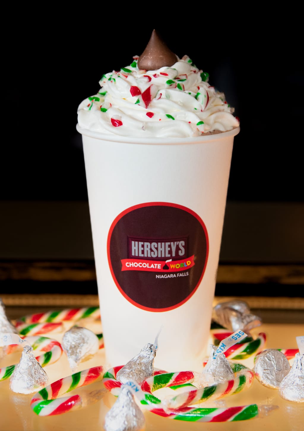 E na Hershey’s Chocolate World, o clima natalino é garantido com o Candy Cane Hot Chocolate, decorado com chantilly, pedaços de bala de menta e um Hershey’s Kiss no topo.